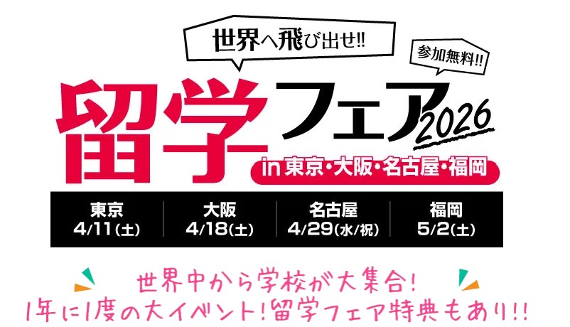 小中高生必見!夏休みの留学に最適なプランや、1週間から参加できるホームステイや語学留学はもちろん、ワーキングホリデーで働きたい方や本格的に長期間留学したい方にとっても、必要な情報が盛りだくさんのフェア!漠然と留学に憧れがある方から具体的に留学プランが決まっている方まで、どんな方でもお気軽にご参加下さい!