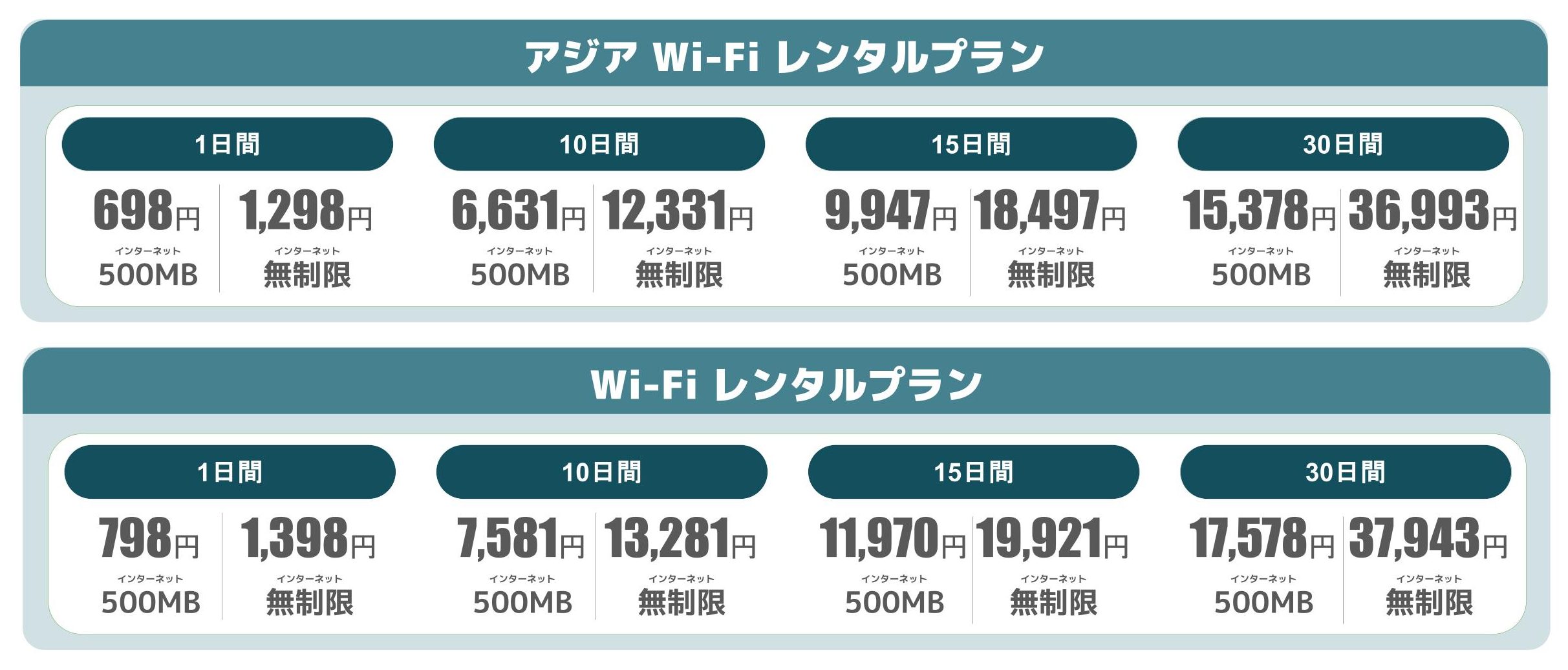 *無制限プランをご案内しておりますが、その他1GB/日、2GB/日、10GB/10日などご希望のプラン構成が可能です。もしご希望がありましたら源までご連絡をください。