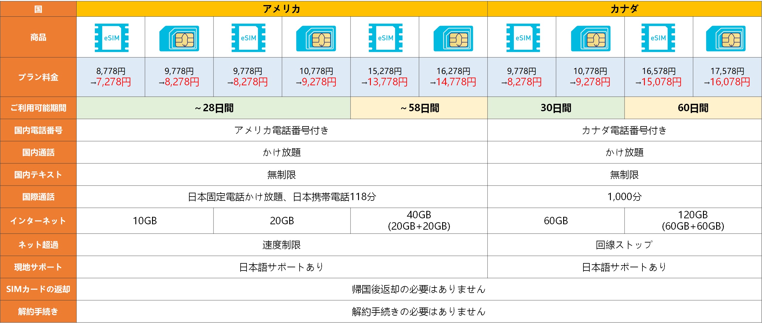 アメリカ:電話番号発行から30日間で20GBご利用いただくことができ、31日目以降にデータがリセットされ20GB新たにご利用いただけるようになります。