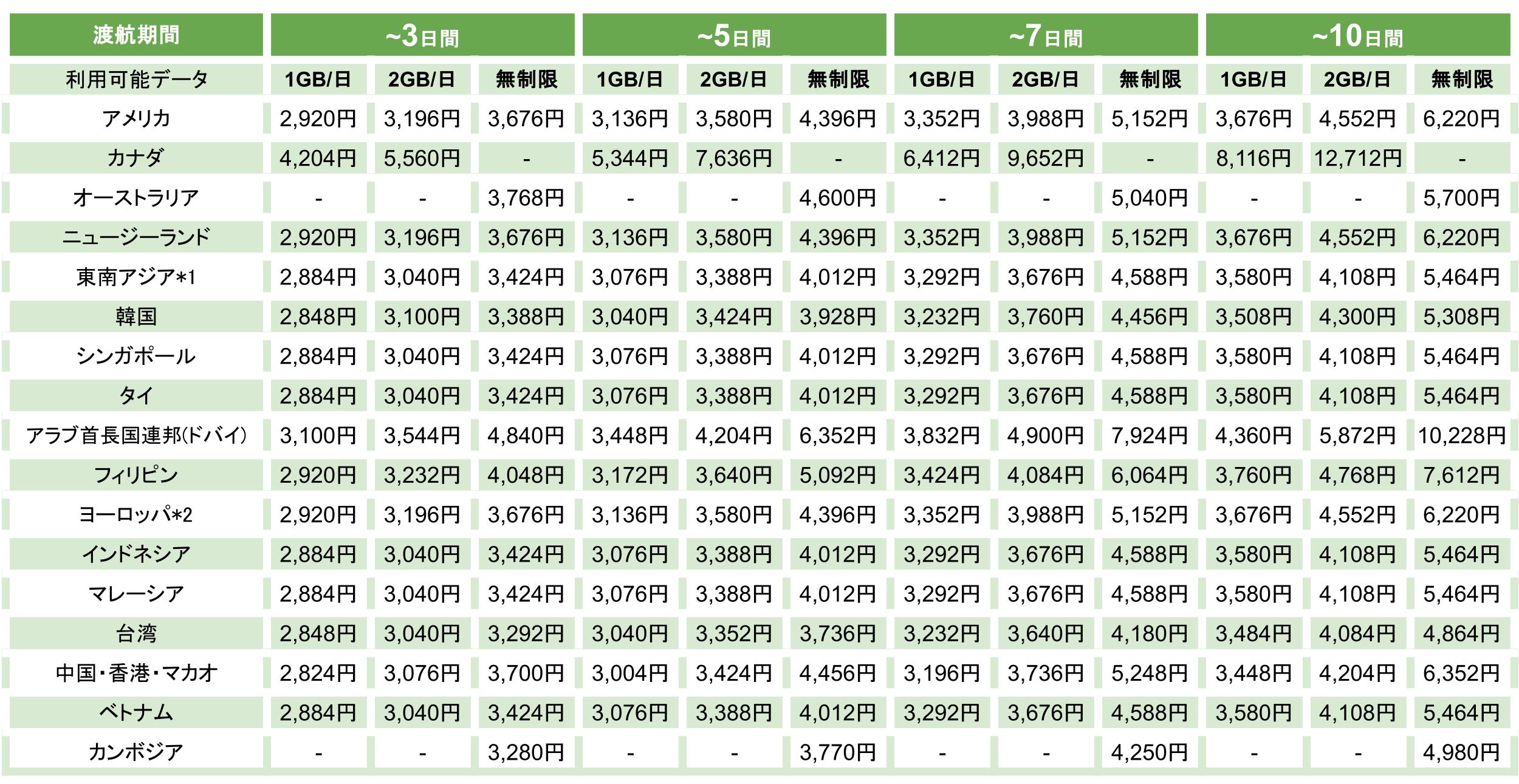 *グアムに関しましては電話番号付きで7日間、8日間のサービスを別ページでご案内をしております。 *カナダはデータeSIMより電話番号付き短期eSIM/SIMの方がお安くなる場合がございます。30日未満短期向けを一度ご確認ください。こちら