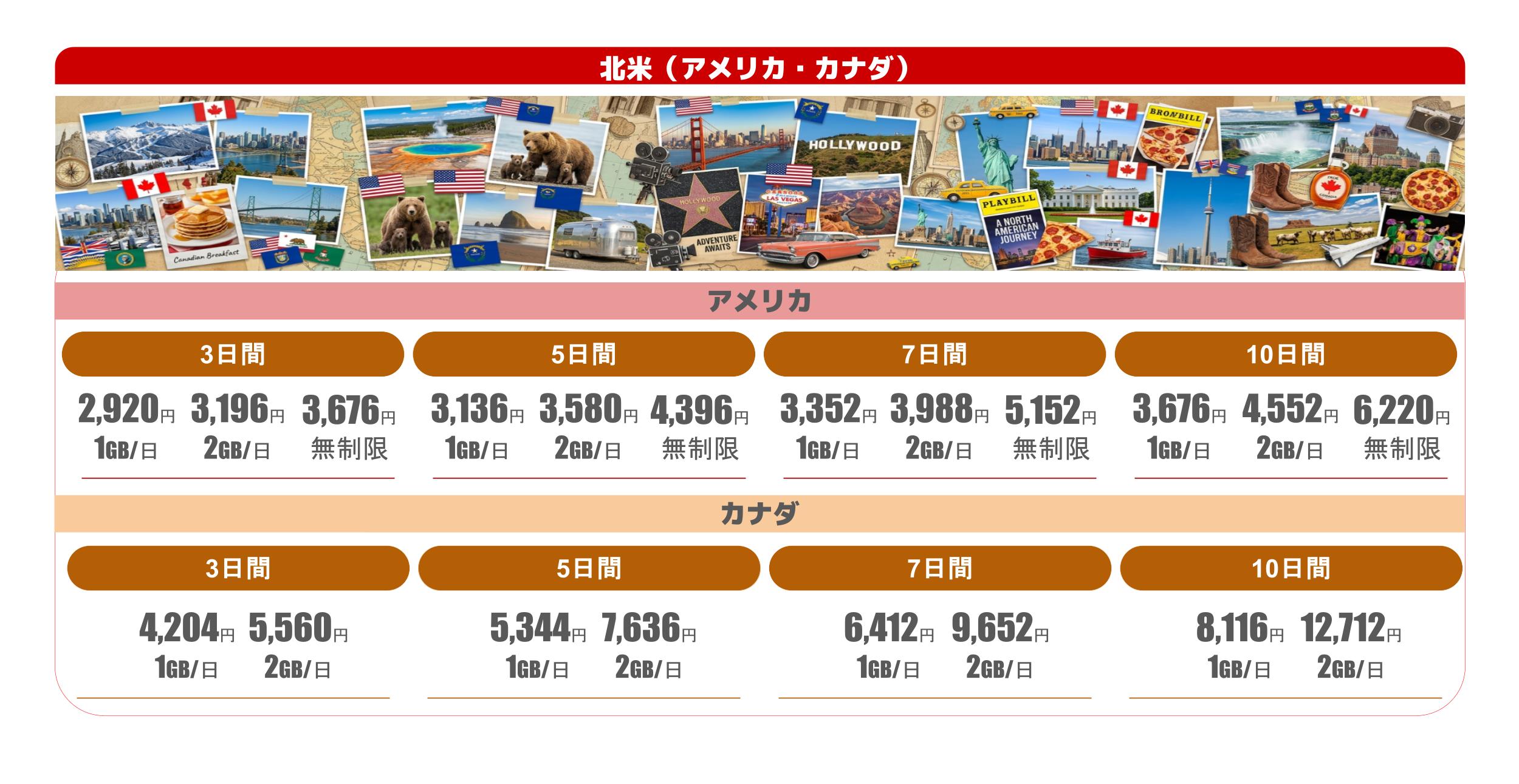 *カナダは無制限プランはありません。渡航期間によっては電話番号付きの方がお安くご利用いただけますのでこちらも併せてご確認ください。